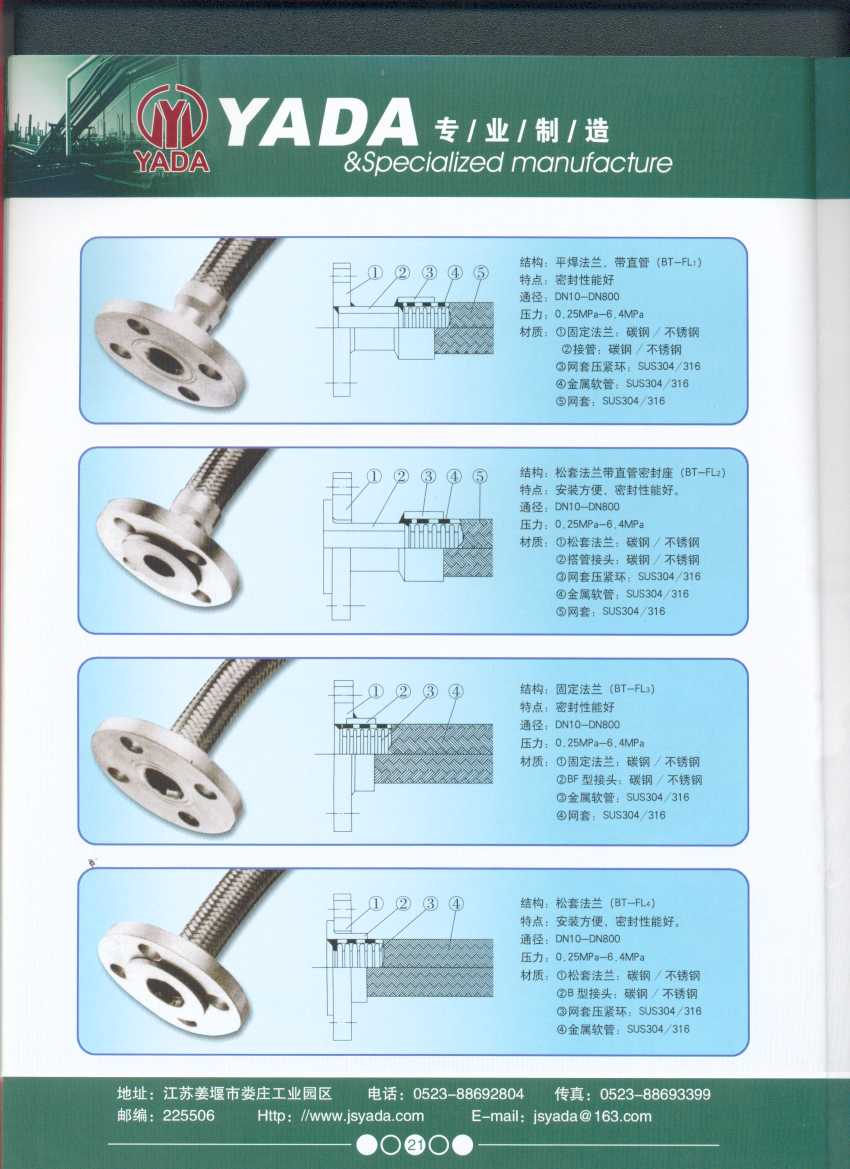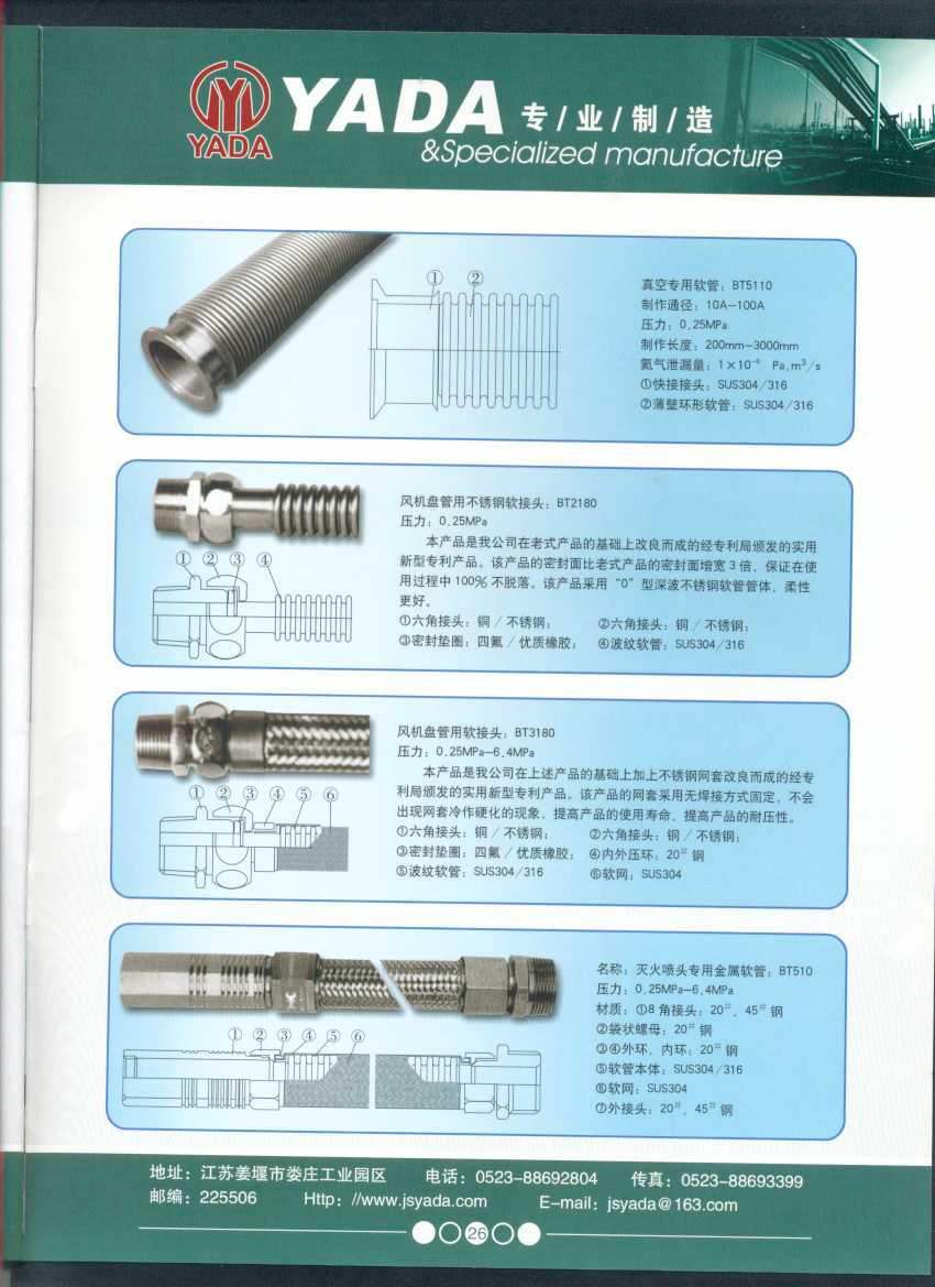 秉天時 籍地利 仰人和 虔誠一個永恒的理念,創(chuàng)新永續(xù).百諾不如一信,亞達人堅持以信為本,視客戶如同上帝,把對信譽的追求,體現(xiàn)在嚴格的質(zhì)量控制和完善的客戶服務(wù)上,讓客戶百分之百滿意是亞達人不變的信念。 本廠系ISO9001質(zhì)量認證企業(yè)、計量合格企業(yè)。本廠專業(yè)致力于生產(chǎn)不銹鋼金屬波紋軟管、超高壓、高壓膠管、波紋管補償器(膨脹節(jié))、立式、臥式、冷卻器。本廠產(chǎn)品具有承受壓力高、彎曲半徑小、抗疲勞性能強、使用壽命長等特點。廣泛應(yīng)用于電力、石化、冶金、水泥建材、工程機械、礦山及液壓系統(tǒng)。產(chǎn)品暢銷全國各地。 今日亞達之成功源自諸多客戶的厚愛,明天的輝煌更離不開您對我的支持與信賴。查看更多>>